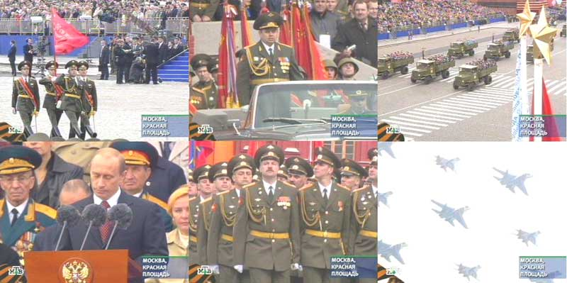 御存知の通り、プーチン大統領を筆頭に米国・ブッシュ大統領フランス・シラク大統領他、中国・胡錦濤国家主席や国連のアナン総長などの他、かつての枢軸国であるドイツ・シュレーダー首相、イタリア・ベルルスコーニ首相、日本・小泉首相らが参観しました。市街地の退役軍人パレードさえ、もはや西側諸国・東側諸国でも行なわなくなってしまいましたがロシアでは縮小されつつある中健在で毎年師団単位で楽隊がついた小規模パレードも行なわれています。