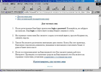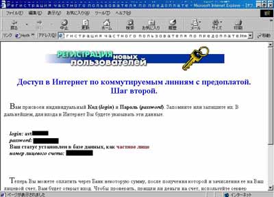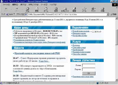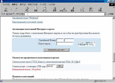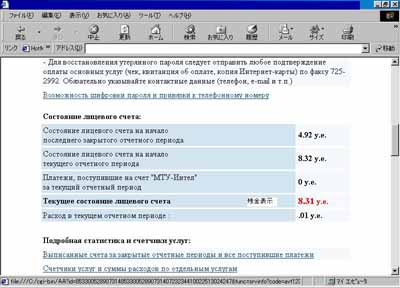 その5 トップページに戻りますと今度は”Личная статистика”と書かれてあるところに自分のIDとパスワードを入力して写真のような画面に飛びます。ここではあといくら残っているかとかのあなたの個人情報が載っております。そこで下のほうにあるカード番号とカードの暗証番号を入力する場所に必要事項を記入してボタンを押すとこれでお金が振りこまれたことになります。 今度はダイアルネットワークに自分のMTUで取得しましたIDとパスワードを入力して接続すると振り込んだお金分だけは使えるようになります。 |