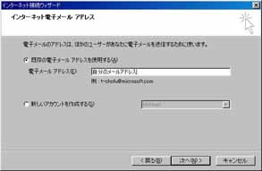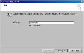 E そして右上にある”追加”を選び、”メール”というボタンを押すと写真のように”インターネット接続ウィザード”が出てきます。 F 最初に自分の好きな名前を入力します。(これが相手にメールを送ったときに通知される名前です。)そして”次へ”を押します。 |