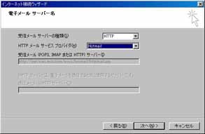 H そうすると写真のような画面がでてきますので”受信メールサーバーの種類”で”HTTP”を選び、”HTTPサービスメールのプロバイダ”で”hotmail”を選びます。 |