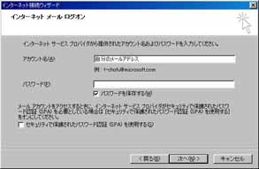 I 次に進むと自分のメールアドレスとパスワードを入力する画面になります。ここではhotmailで取得しましたアドレスとパスワードを入力しましょう。そうすると完了です。 あとはhotmailにある自分のメールを受信しておけば接続を切断しても自分のPCで読むことができます。 |