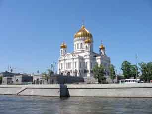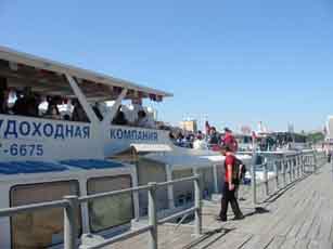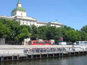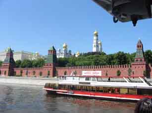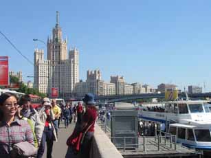 船着場は何箇所か存在します。 さて船の出発は、赤の広場からそう遠くない地下鉄キタイ・ゴーラド駅近くの船着場からです。モスクワ川をずずーっと下り、普段とは違う角度から中心部を眺め、やがて郊外へ入りかなり風景が森っぽくなってきた所で折り返して再びもとの船着場へ。時間にして2時間半ほどだったでしょうか。途中にはお馴染みクレムリン、ウクライナホテル、ゴーリキー公園、モスクワ大学、スポーツアリーナなどなどが見られるのですが、船から見上げる景観は普段とはまた違った感覚で、なかなか楽しむことが出来ました。それも一気に見ることが出来るので、かなり得した気分です。
